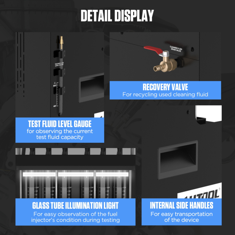 INTELIGENTNY UKŁAD STEROWANIAModel CT500 wyposażono w mikrokomputerowy system kontroli, który chroni elektronikę wtryskiwacza przed przegrzaniem. Użytkownik ma pełną kontrolę nad każdym parametrem testu. Zaawansowane funkcje panelu: