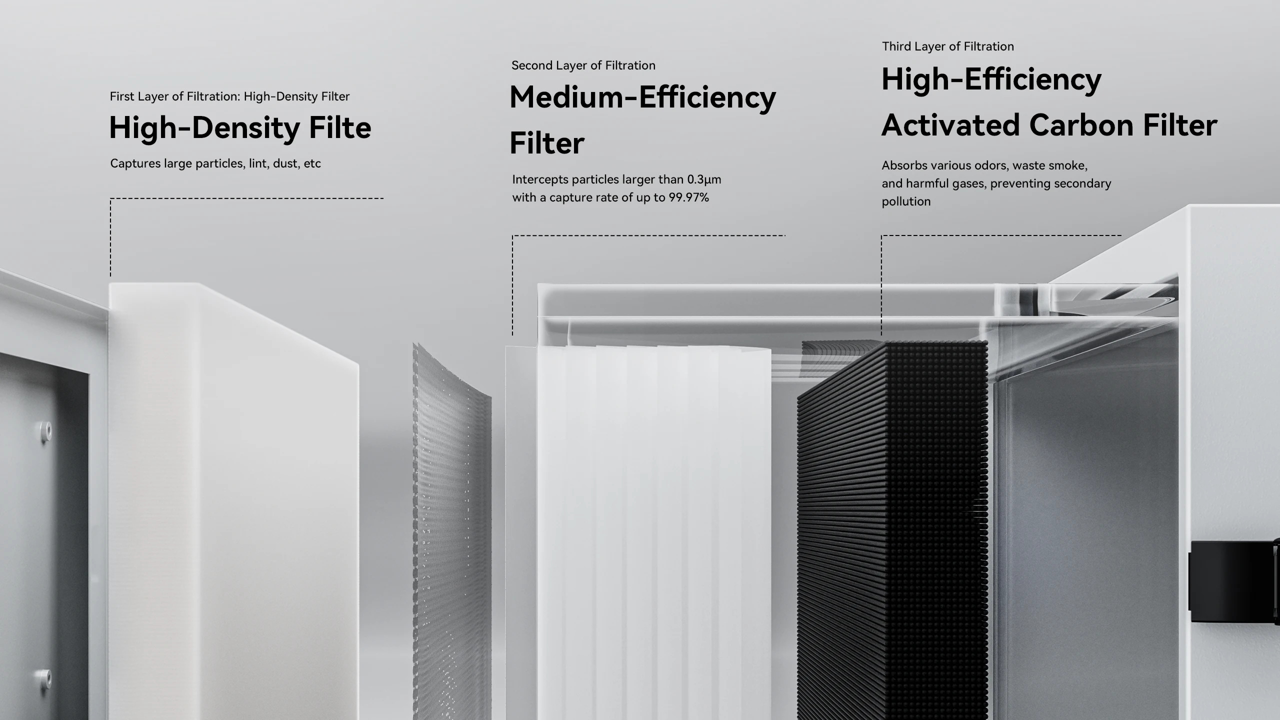 Budowa filtra: 3-warstwowa (bawełniany filtr wstępny -> filtr średni HEPA -> węgiel aktywny)