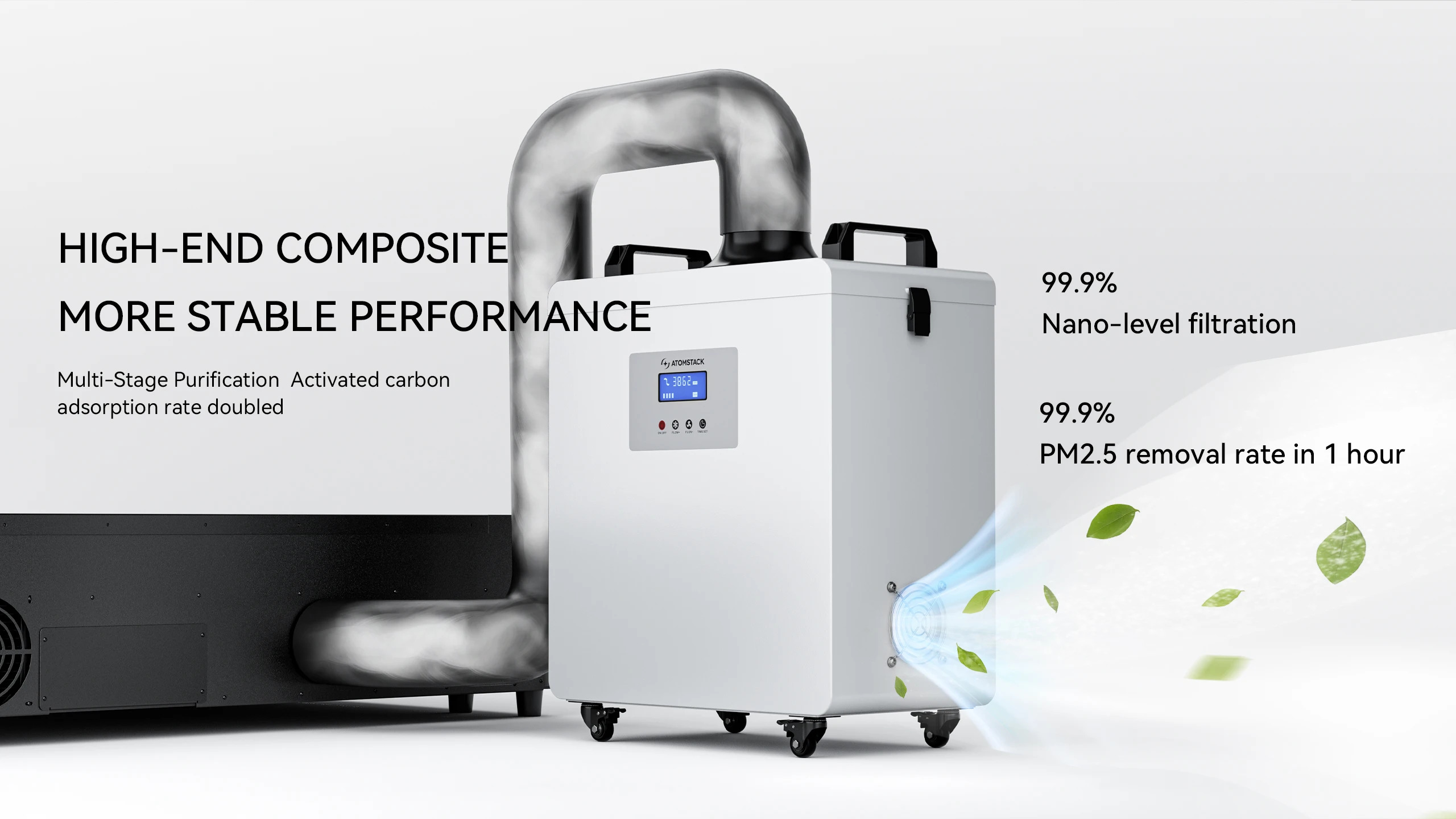 Jego największą przewagą jest zaawansowany, 3-warstwowy system filtracji (filtr wstępny bawełniany + fitr średni HEPA + węgiel aktywny ), który radzi sobie nawet z najgęstszym zadymieniem z cięcia akrylu czy sklejki.