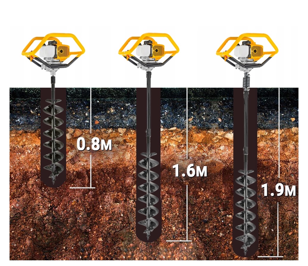 Komplet wierteł 100 / 200 / 300 mm + przedłużki 80 cm i 30 cm pozwalają wiercić otwory o różnych głębokościach – nawet do ok. 1,9–2,0 m (w zależności od warunków gruntu i techniki pracy).