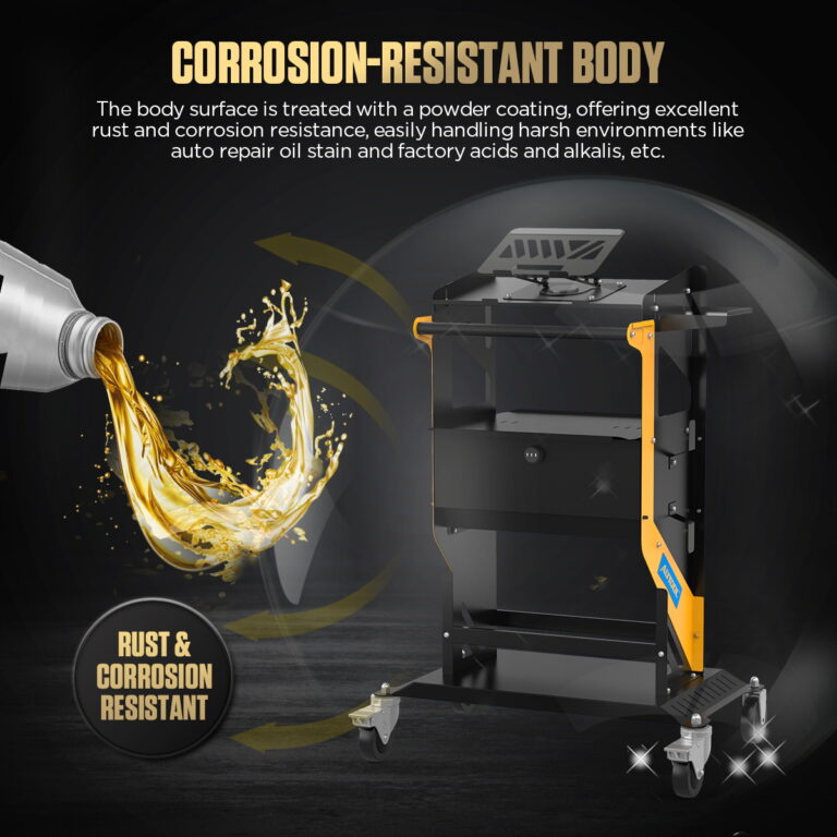 - Ciche koła Heavy Duty: 4-calowe, łożyskowane koła skrętne poruszają się bezszelestnie, nie niszcząc posadzki warsztatowej.